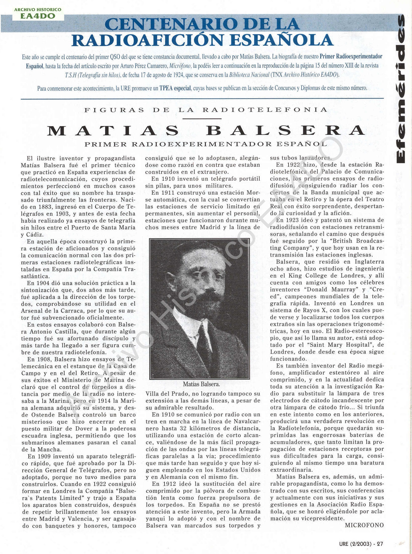 1883-1953 - Matías Balsera Rodríguez, primer radioaficionado y DX-ista español en 1903.