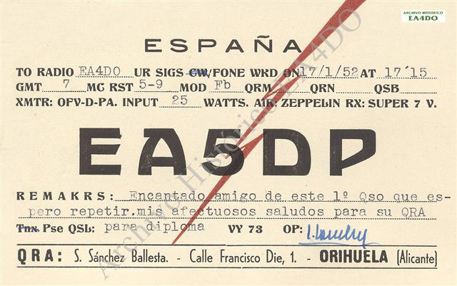 Según me han contado, Ignacio pudo rescatar y validar de nuevo su indicativo EA5BM a partir de 1949. Era maestro de obras, muy conocido en Orihuela y hermano del médico pediatra Santiago Sánchez Ballesta. En 1950, posiblemente influenciado por su hermano Ignacio, obtiene el indicativo EA5DP. Como anécdota, fue mi médico desde los 0 a los 6 años, edad en la que nos trasladamos a Canarias, además éramos vecinos, yo vivía en el 28 de la calle Santiago. Siempre, en Canarias, mi padre me hablaba de su hermano Ignacio y la gran antena de hilo largo que atravesaba la calle Santiago.