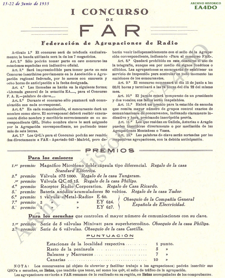 En 1934 cambiaron los indicativos en España a los que ahora conocemos, por distritos, y pasó a ser EA5BM, indicativo con el que consiguió el Primer Premio del “I Concurso de FAR” en 1935.