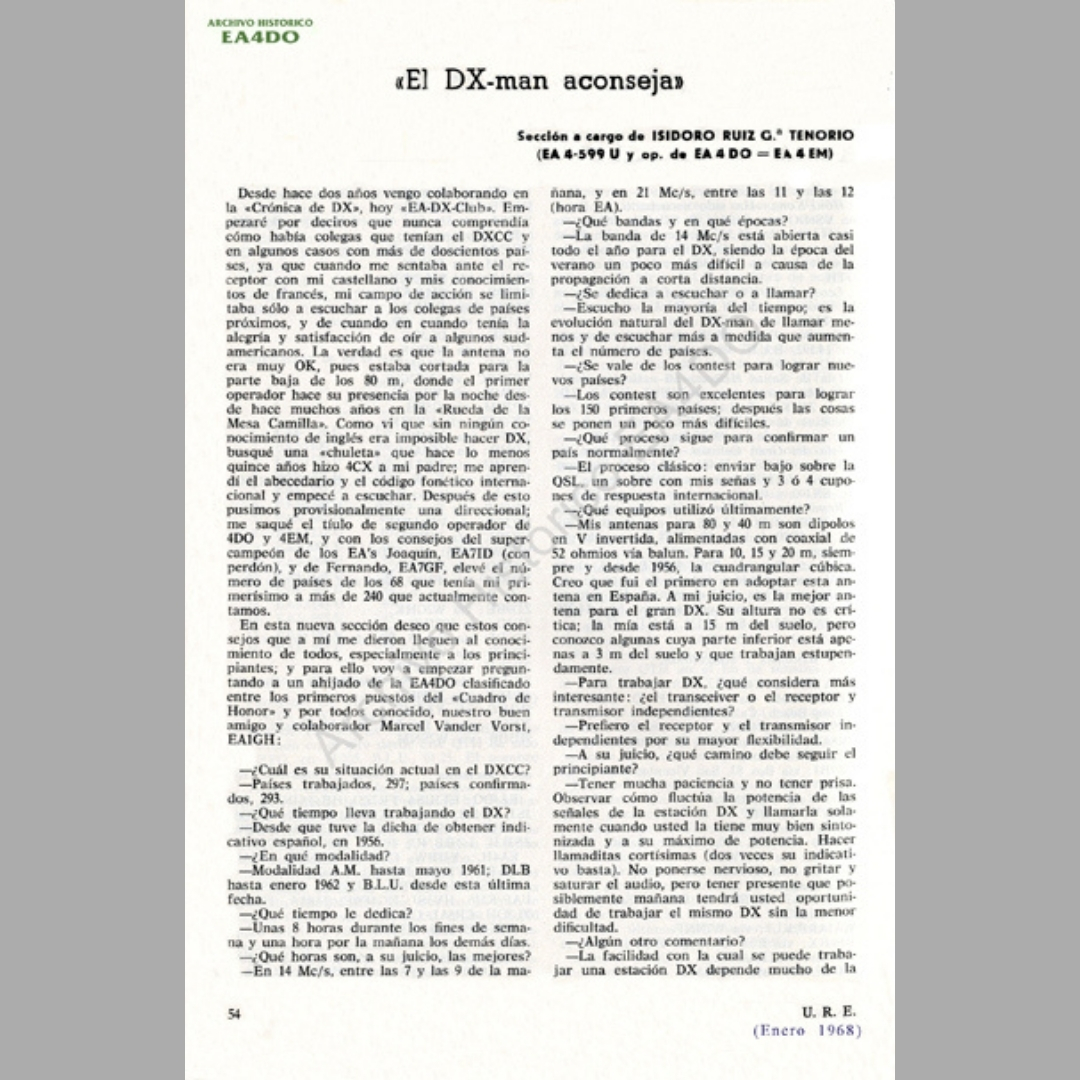 Enero 1968 - El DX-man aconseja: Marcel Vander Vorst, EA1GH. (Isidoro Ruiz-Ramos.- URE, enero 1968)