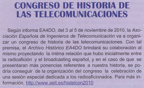 Texto presentado (en inglés): “First Spanish Ham Radio Congress.” (Publicado en “A century of broadcasting – HISTELCON 2010 Madrid – Conference Proceedings”. Octubre 2010)
