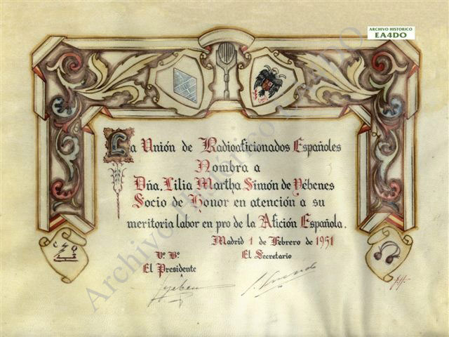 Lilia fue desde febrero de 1951 Socio de Honor de la Unión de Radioaficionados Españoles además de XYL de uno de los grandes personajes de nuestra afición: Santos Yébenes Muñoz. Santos operó en las primeras décadas de nuestra radio con el indicativo EAR-233 y en 1934 éste le fue sustituido por el EA5BA. Ya en Madrid finalizada la Guerra Civil, le fue otorgado el distintivo EA4CR e identificándose habitualmente como EA4 ClavelesRojos pasó el resto de sus días. Firmante del Acta de Constitución de URE el 1º de abril de 1949 se hizo cargo de la tesorería de su primera Junta Directiva. Posteriormente fue elegido Vicepresidente, siendo nombrado finalmente Presidente de Honor. Colaboró en la revista URE desde el comienzo de su publicación dando a conocer las bases de los principales diplomas y más tarde incluyendo informaciones sobre DX.