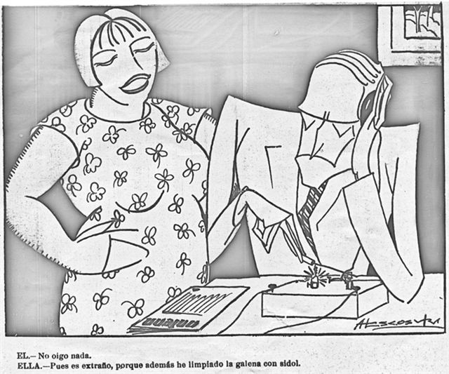 Antes, mucho antes de las diez hallábase todo preparado: limado el grifo, casi hasta mellarlo; puesta la clavija de antena para colocarla alternativamente en aquel de los conectores en que el sonido fuera más exuberante. Surgió de improviso un serio contratiempo: los domicilios madrileños, a más de incómodos, caros y antihigiénicos, carecen de topografía para la radio-difusión. Los grifos y cañerías (ya que es de ob-servar que la mejor tierra a tomar es la del Lozoya como todos sabemos) se encuentran a disparatadas distancias de los enchufes eléctricos y así el aparato de galena flotaba en la atmósfera entre grifo y antena sin punto de apoyo posible. Hubimos pues, de mantener sobre las rodillas el aparatito y comenzamos a pinchar buscándole el flaco a la galena.