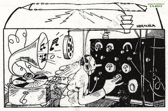 Y, en efecto, un gramófono, que o es siempre muy malo o suena muy mal cuando se retransmite su música, comienza a lanzar sus desgarradoras notas envueltas en ese ruido de raspado tan característico de esta clase de aparatos. Entre tanto el radiopita ha acudido al teléfono para recibir los informes que le suministran aficionados de tan buen humor como él. Nueva aparición en el “estudio”.