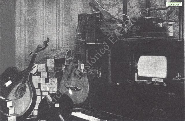 En nuestra visita nos acompañó el querido camarada “Alfonsito” (popular fotógrafo madrileño) y él puede atestiguar de que fuera inútil que intentásemos describir la estación. Montones, así montones, montones de aparatos y accesorios sobre el suelo, sobre las sillas, las mesas y los aparadores de un suntuoso comedor antiguo; y cables, cables por todas partes, a todas las alturas y en todas direcciones. Y en una pieza inmediata la pianola, el gramófono, los instrumentos de la “orquesta” y un micrófono pendiente del techo. Informadores profanos nos fue más fácil describiros las instalaciones maravillosas del “Electra”, el navío Marconi, que el maremagnum del radiochiflado Prieto.