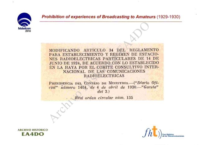 Ante el reiterado incumplimiento por parte de ciertos aficionados del mencionado Reglamento de 1924, que prohibió a los amateurs emplear sus estaciones para emitir como las de broadcasting, más de cinco años después, en 1929, el Director General de Comunicaciones se vio obligado a enviar un escrito al Presidente de E.A.R. reprendiendo tal indisciplina. El 2 abril 1930, se publicó una Real orden modificando el Articulo 34 del Reglamento mediante la que se dispuso que los aficionados solamente podrían realizar comunicaciones relativas a pruebas, ensayos, o regulación de aparatos, con exclusión absoluta de cualquier otra clase de mensajes.