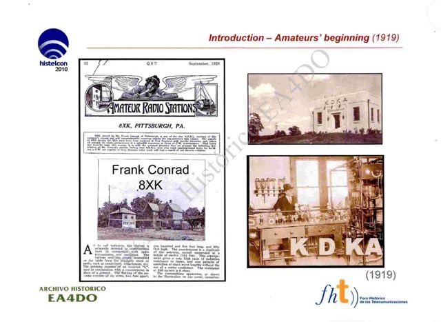 en 1912 se publicó una Ley en los Estados Unidos mediante la que se permitió a los amateurs experimentar únicamente en longitudes de onda inferiores a 200 metros, por considerar entonces los investigadores que tales frecuencias del espectro radioeléctrico no tenían aplicación alguna. Pero se equivocaron, los aficionados pronto comprobaron durante sus pruebas que lograban alcanzar sucesivamente mayores distancias en sus comunicaciones bilaterales y ello les animó a continuar. Fue a finales de la segunda década del Siglo XX cuando algunos amateurs de los Estados Unidos y Europa iniciaron emisiones de música y palabra, lo que dio origen a las primeras estaciones de radiodifusión. Ejemplo lo tenemos en la pionera KDKA de Pitsburg que nació del transmisor de Frank Conrad operador de la “8XK”.