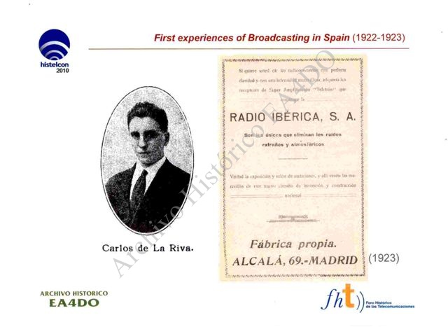 Al no haber entonces estaciones a las que poder escuchar fácilmente y con objeto de vender más receptores, se le ocurrió construir un pequeño transmisor y emitir la música grabada en los discos de gramófono. Consecuencia de las emisiones de Carlos De la Riva fue la creación de la primera empresa española con actividad radiodifusora: Radio Ibérica, cuya dirección técnica recayó en Carlos De la Riva y también en su hermano Adolfo.